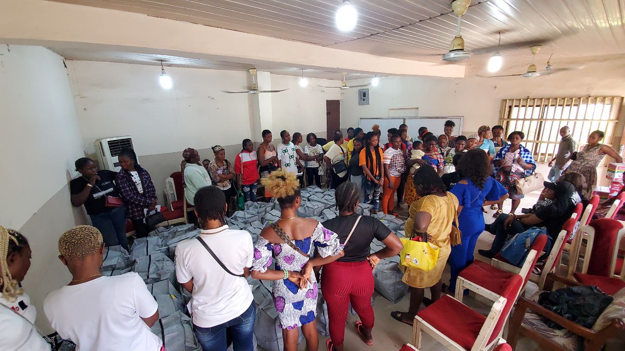 After the training, each beneficiary received a bag of rice, a bag of beans, a bag of garri, a keg of palm oil, a barrel of groundnut oil, three rows of sachet tomato paste, a cartoon of indomie noodles, a sachet of milk, a sachet of milo beverage, food spices, a sachet of salt, six packs of spaghetti, two sachets of detergent, two rows of bathing soap, a toothbrush, toothpaste, deodorant spray and roll-on, five packs of sanitary pads, three packs of toilet tissue and a transportation stipend.